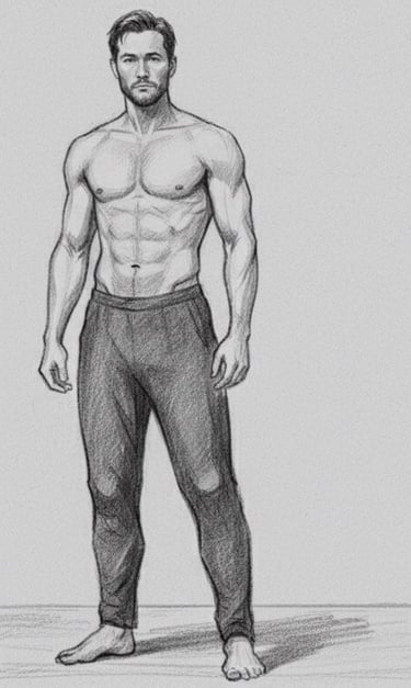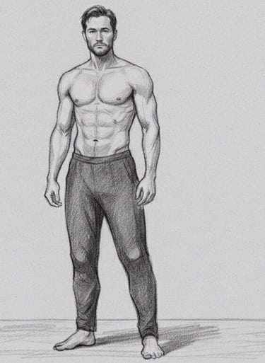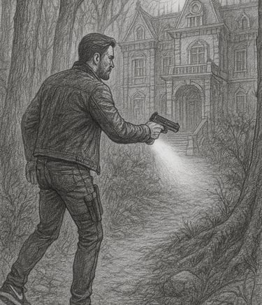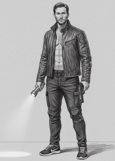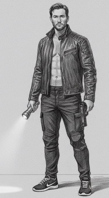 Descripción Física: Complexión delgada atlética, cabello castaño oscuro, barba descuidada, ojos con ojeras pronunciadas por años de insomnio.